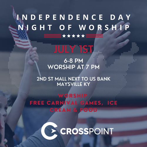 You are invited! Friday, July 1, at the second street mall in Downtown Maysville (next to US Bank) join us as we celebrate Independence Day with a night of worship led by CrossPoint Community Church. All veterans, active military and first responders will be honored. Free Ice cream, food and carnival games for the kids will be available from 6-7 PM and music begins at 7 PM. Bring a lawn chair and a friend. Friday, July 1, at the second street mall in downtown Maysville we hope you will join us as we kick off the July 4th weekend!
